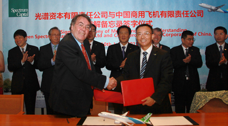 中國經(jīng)濟網(wǎng)訊 2012年7月10日,范堡羅航展第二天,中國商飛公司與光譜資本有限責任公司(以下簡(jiǎn)稱(chēng)光譜公司)在英國倫敦簽署諒解備忘錄。