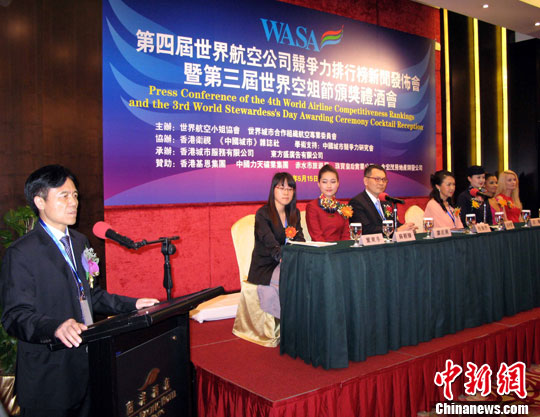 5月15日,由世界航空小姐協(xié)會(huì )等主辦的“第四屆世界航空公司競爭力排行榜新聞發(fā)布會(huì )暨第三屆世界空姐節頒獎禮酒會(huì )”在香港舉行。中新社發(fā) 任海霞 攝