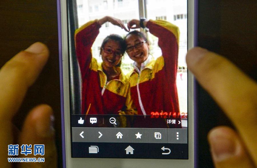 7月8日,江山中學(xué)高一(10)班一名學(xué)生在手機上展示QQ空間里王琳佳(右)和葉夢(mèng)圓的合影。在韓亞航空舊金山墜機事故中不幸罹難的兩名中國乘客,是浙江省江山中學(xué)高一年級的學(xué)生王琳佳和葉夢(mèng)圓。她們從初中起就是同學(xué),是很要好的朋友。兩人的離去,給師友留下無(wú)盡的思念。新華社記者韓傳號攝