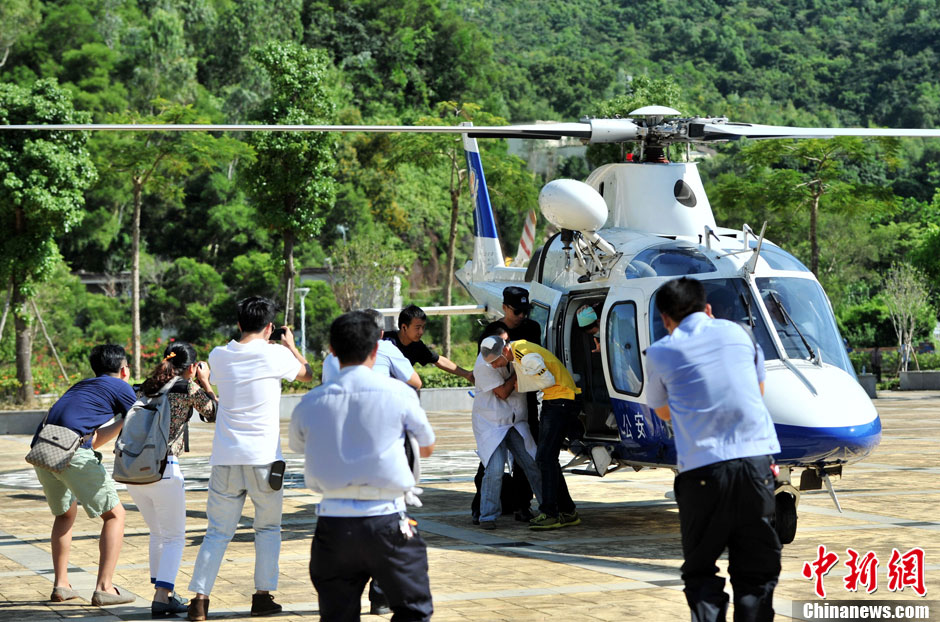 8月27日,深圳市公安局交警支隊在大鵬新區西涌舉行突發(fā)交通事故應急演練。演練模擬該地區車(chē)流量大,發(fā)生事故后該路段出現擁堵,處置和救援人員無(wú)法進(jìn)入事故現場(chǎng),急調警用直升機飛赴事故現場(chǎng)進(jìn)行處置,轉移救治“傷員”。中新社發(fā) 陳文 攝