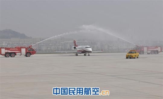 上圖為:飛機滑行中接受了大連國際機場(chǎng)給予的最高規格禮遇——水幕洗塵