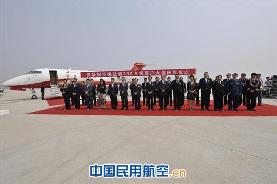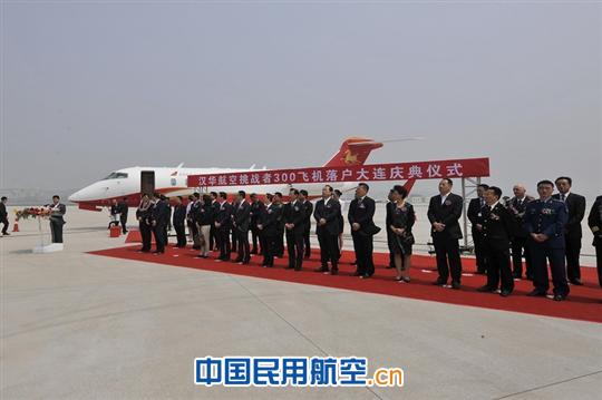 上圖為:漢華航空首架挑戰者300飛機落戶(hù)大連儀式現場(chǎng)