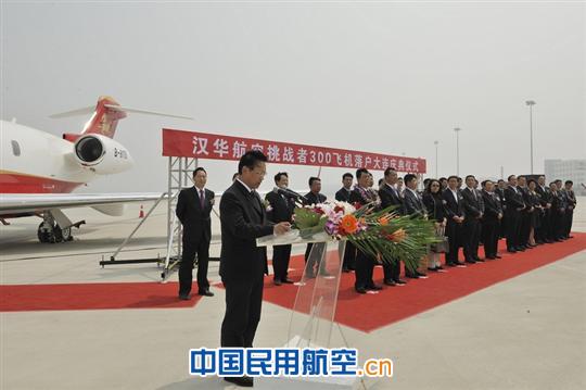 在歡迎儀式上,漢華公務(wù)機航空有限公司總裁楊建新、大連國際機場(chǎng)集團有限公司副總經(jīng)理杜志淵、大連港口口岸局局長(cháng)高連分別致辭。楊建新總裁對各位來(lái)賓的光臨表示了熱烈的歡迎和衷心的感謝,漢華公務(wù)機航空有限公司首架挑戰者300型飛機的成功引進(jìn)并正式落戶(hù)大連,得到了民航東北地區管理局、大連市人民政府以及大連國際機場(chǎng)和其他各有關(guān)方面的大力支持協(xié)助,首架飛機的入列,標志著(zhù)漢華公務(wù)機航空有限公司進(jìn)入了新的發(fā)展階段,飛機投入運營(yíng)后,公司將始終不渝地堅持“安全第一,預防為主,綜合治理”的指導思想,堅持高起點(diǎn)、高標準、嚴要求,確保飛行安全,努力將漢華航空打造成中國一流公務(wù)機航空服務(wù)品牌。大連市港口口岸局局長(cháng)高連在致辭中對漢華航空首架飛機的成功引進(jìn)表示熱烈的祝賀,對楊建新總裁為首的接機人員表示親切慰問(wèn),衷心希望漢華航空以此為起點(diǎn),不斷加強企業(yè)管理,苦練內功,努力創(chuàng )造新的輝煌,將漢華航空打造成為大連市的一張靚麗的名片,為促進(jìn)東北亞航運中心建設和帶動(dòng)其他產(chǎn)業(yè)發(fā)展作出應有的貢獻。大連國際機場(chǎng)集團有限公司副總經(jīng)理杜志淵在致辭中指出,漢華航空引進(jìn)的首架挑戰者300型飛機也是首架正式落戶(hù)大連的公務(wù)機,是大連國際機場(chǎng)的一件大事,機場(chǎng)方面將不斷完善公務(wù)機運行服務(wù)保障工作,為航空公司的安全運營(yíng)積極創(chuàng )造有利的環(huán)境和條件。