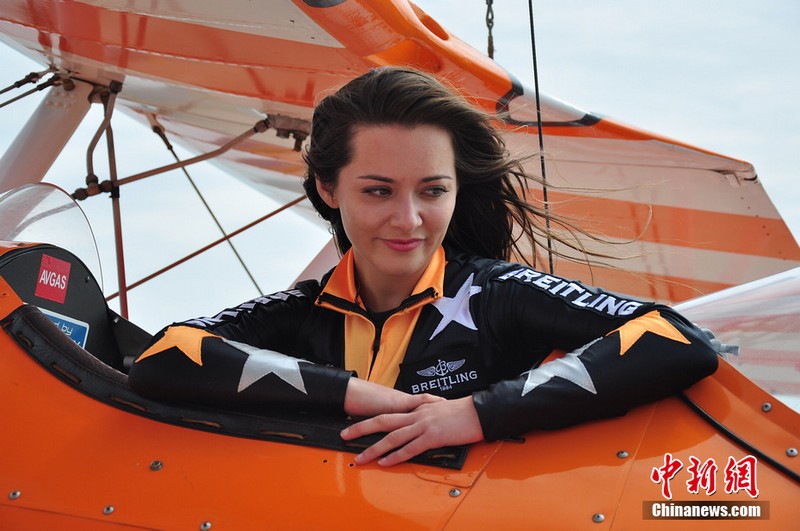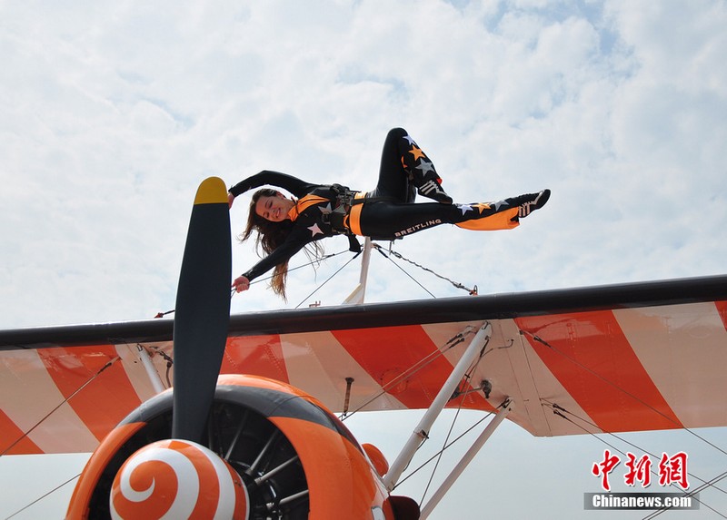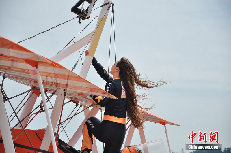11月11日,歐洲“百年靈”機翼行走飛行表演隊的美女表演者在地面停放的飛機上進(jìn)行了表演動(dòng)作展示。
