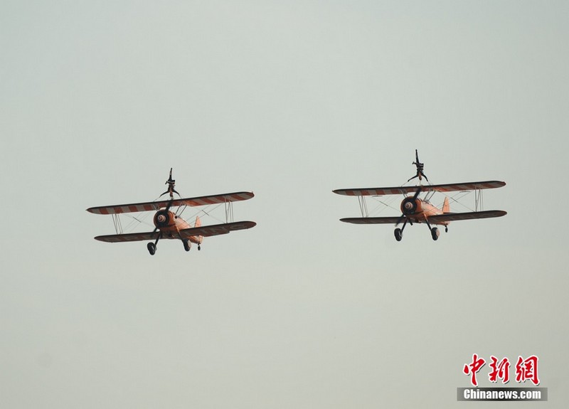 11月11日下午,歐洲“百年靈”機翼行走飛行表演隊表演了精彩的“云中漫步”。兩架飛機上各站有一名美女,在空中表演獨門(mén)舞步和雜技,隨飛機一起“云中漫步”,優(yōu)雅精準!