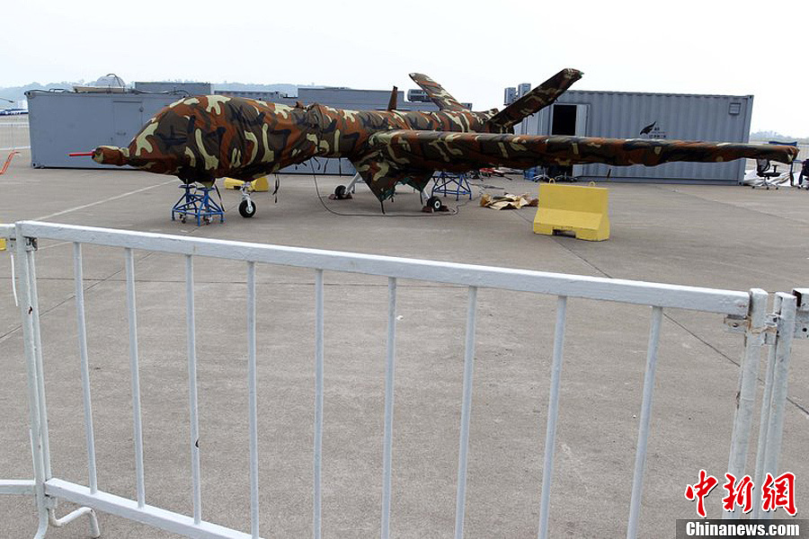曾在前兩屆珠海航展上展出模型的翼龍無(wú)人機,在今年航展上以實(shí)物參展。11月8日,該機已經(jīng)組裝完畢停放在展坪上。該款無(wú)人機由中航工業(yè)旗下成都飛機設計研究所研制,該機裝有一臺100馬力活塞發(fā)動(dòng)機,具備全自主平輪式起降和飛行能力,最大起飛重量達1100公斤,最大續航時(shí)間為20個(gè)小時(shí),可攜帶各種偵察、激光照射/測距、電子對抗設備及小型空地打擊武器,可執行監視、偵查及對地攻擊任務(wù)等任務(wù),也可用于維穩、反恐、邊界巡邏等。