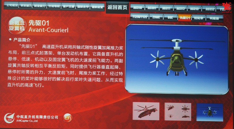 人民網(wǎng)北京11月9日電 (記者 楊鐵虎)中航工業(yè)直升機公司將在第九屆中國航展上展出“先驅01”新概念高速直升機模型。9日下午,中航工業(yè)直升機公司的專(zhuān)家向人民網(wǎng)記者介紹說(shuō),“先驅 01”新概念高速直升機采用共軸式剛性旋翼加尾推力槳布局,前三點(diǎn)式起落架,單臺發(fā)動(dòng)機布置。具備直升機的懸停、低速、機動(dòng)以及固定翼飛機的大速度前飛能力。