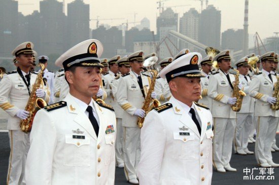 中國第一艘航空母艦遼寧艦艦長(cháng)張崢(前右)政委梅文(前左)