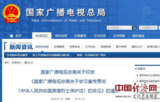 經(jīng)濟日報-中國經(jīng)濟網(wǎng)北京7月11日訊 近日,國家廣播電視總局印發(fā)《國家廣播電視總局關(guān)于學(xué)習宣傳貫徹〈中華人民共和國英雄烈士保護法〉的意見(jiàn)》(以下簡(jiǎn)稱(chēng)《意見(jiàn)》)的通知?!兑庖?jiàn)》指出:鼓勵和支持廣播電視播出機構、信息網(wǎng)絡(luò )視聽(tīng)節目服務(wù)單位、廣播電視節目制作經(jīng)營(yíng)機構等創(chuàng )作以英雄烈士事跡為題材、弘揚英雄烈士精神的專(zhuān)題片、紀錄片、訪(fǎng)談節目、綜藝節目、電視劇、網(wǎng)絡(luò )視聽(tīng)節目等;鼓勵英雄烈士題材的劇目積極申報電視劇選題規劃、網(wǎng)絡(luò )原創(chuàng )視聽(tīng)節目規劃。