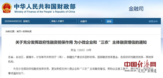經(jīng)濟日報-中國經(jīng)濟網(wǎng)北京4月3日訊 繼3月31日召開(kāi)的國務(wù)院常務(wù)會(huì )議提出“降低政府性融資擔保費率,減輕中小微企業(yè)綜合融資成本負擔”之后,4月1日財政部發(fā)布《關(guān)于充分發(fā)揮政府性融資擔保作用 為小微企業(yè)和“三農”主體融資增信的通知》(以下簡(jiǎn)稱(chēng)《通知》),要求地方各級政府性融資擔保、再擔保機構2020年全年對小微企業(yè)減半收取融資擔保、再擔保費,力爭將小微企業(yè)綜合融資擔保費率降至1%以下。進(jìn)一步提高支小支農業(yè)務(wù)占比,確保2020年新增小微企業(yè)和“三農”融資擔保金額和戶(hù)數占比不低于80%。