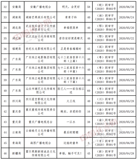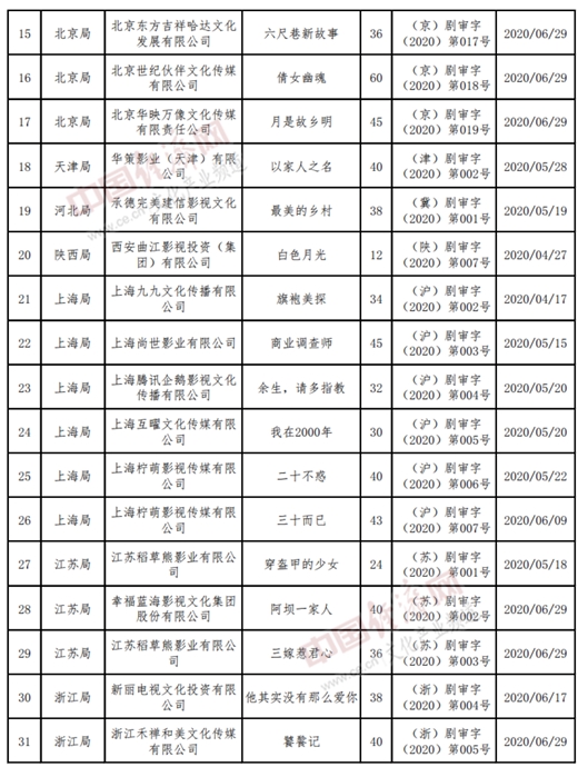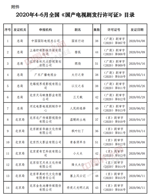 以下為2020年4至6月全國《國產(chǎn)電視劇發(fā)行許可證》目錄: