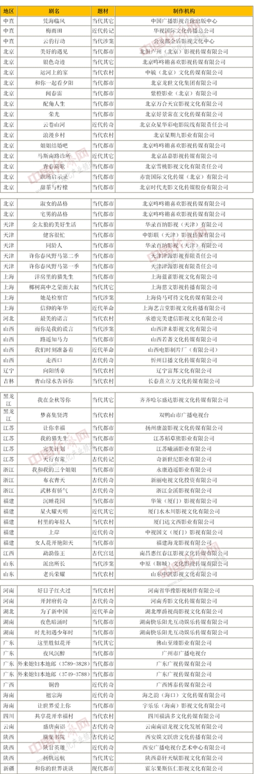 《國家廣播電視總局辦公廳關(guān)于2020年9月全國拍攝制作電視劇備案公示的通知》明確,按題材劃分,當代題材50部、1619集,分別占公示總數的71.43%和71.01%,其中,當代都市題材30部963集,當代農村題材10部349集,當代涉案題材4部130集,當代其它題材6部177集。