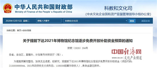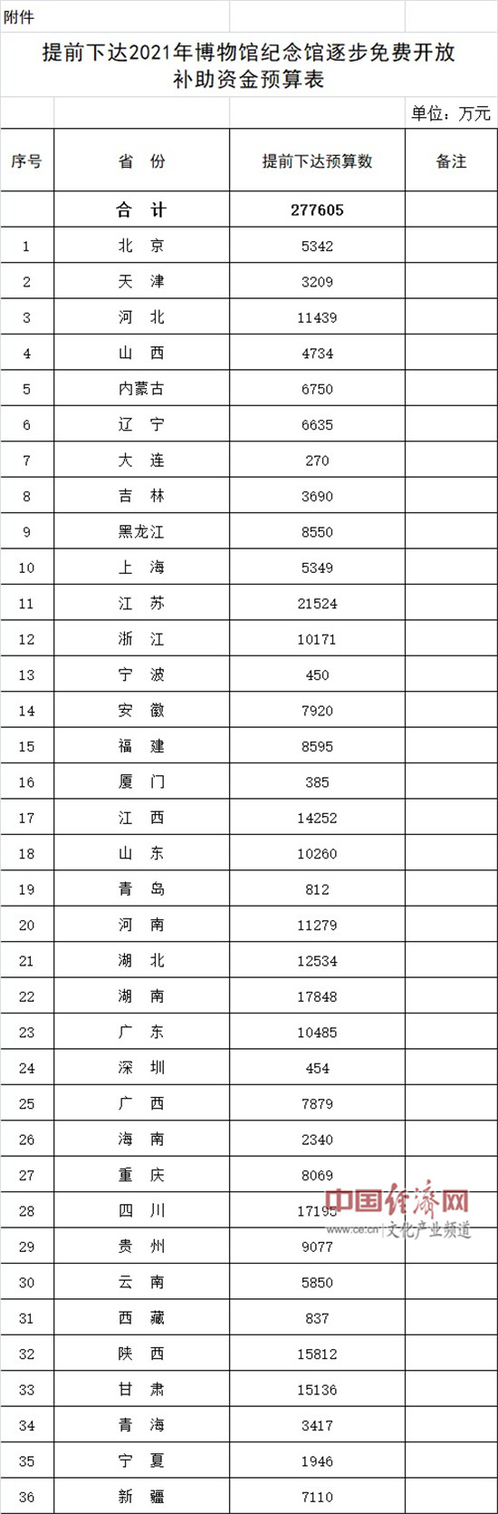經(jīng)濟日報-中國經(jīng)濟網(wǎng)北京12月15日訊 近日,財政部官網(wǎng)發(fā)布了《關(guān)于提前下達2021年博物館紀念館逐步免費開(kāi)放補助資金預算的通知》,31個(gè)?。ㄗ灾螀^、直轄市)及5個(gè)計劃單列市補助資金預算總計277605萬(wàn)元。