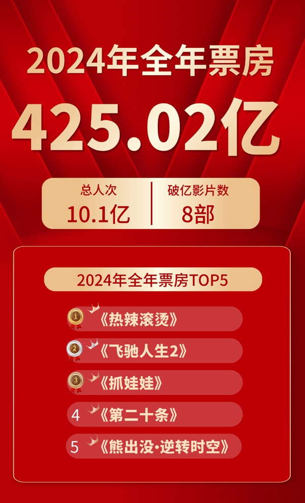 中國經(jīng)濟網(wǎng)北京1月2日訊 據國家電影局統計,2024年全年總票房425.02億,城市院線(xiàn)觀(guān)影總人次10.1億。其中,國產(chǎn)影片票房為334.39億元,占比78.68%。