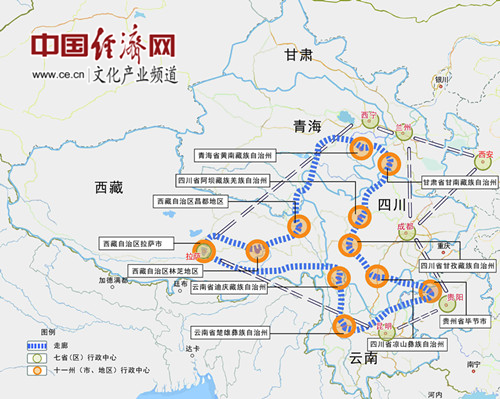 藏羌彝文化產(chǎn)業(yè)走廊依托的城市樞紐包括:四川省成都市、貴州省貴陽(yáng)市、云南省昆明市、西藏自治區拉薩市、陜西省西安市、甘肅省蘭州市和青海省西寧市。