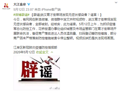 謠言粉碎機二:武漢育才街菜場(chǎng)發(fā)現無(wú)癥狀感染者?謠言!