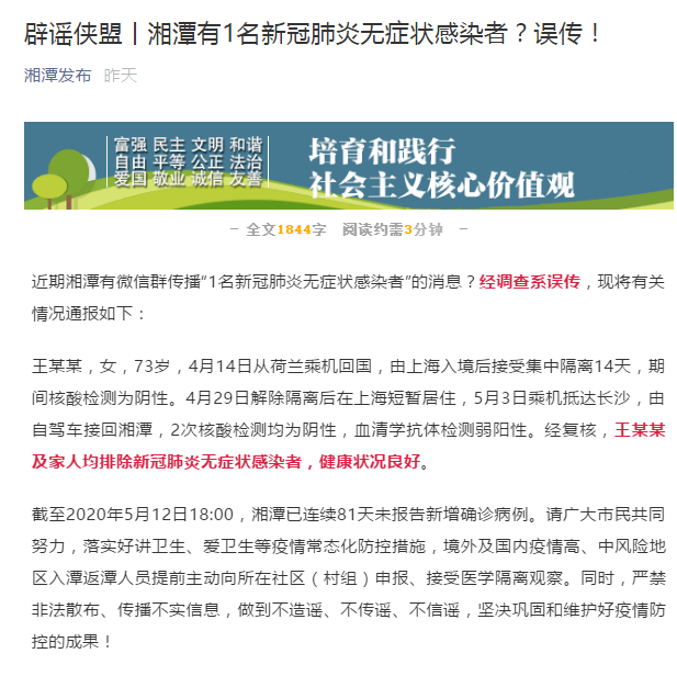 謠言粉碎機四:湖南湘潭有1名新冠肺炎無(wú)癥狀感染者?不實(shí)!