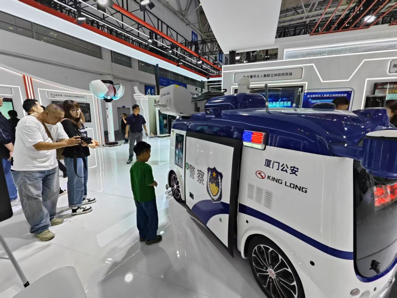 頭頂無(wú)人機、肚藏機器狗……集多種科技于一身的無(wú)人安防警車(chē)吸引了小朋友的目光。 中國經(jīng)濟網(wǎng)記者梁木攝