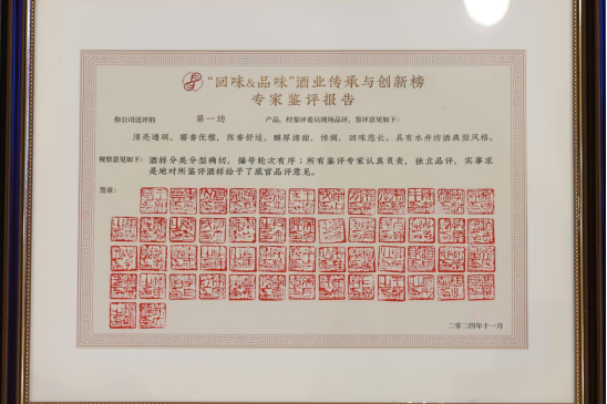 “清亮透明。窖香優(yōu)雅,陳香舒適。醇厚綿甜,協(xié)調,回味悠長(cháng)。具有水井坊酒典型風(fēng)格?!薄盎匚?amp;品味”酒業(yè)傳承與創(chuàng )新榜專(zhuān)家鑒評報告也給予水井坊“第一坊”高度評價(jià)。