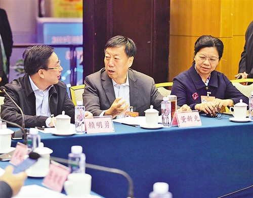 左圖 3月10日,全國政協(xié)民建界別在駐地舉行小組會(huì )議。會(huì )前,全國政協(xié)委員蒙曉靈、董新光、賴(lài)明勇(從右至左)就“如何探索生態(tài)優(yōu)先、綠色發(fā)展為導向的新路子”展開(kāi)交流。 本報記者 高興貴攝