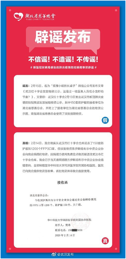 經(jīng)濟日報-中國經(jīng)濟網(wǎng)北京2月17日訊 (記者朱國旺 郭文培) 2月15日,名為"狐貍小姐的長(cháng)桌子”微信公眾號發(fā)布文章《武漢紅十字會(huì )發(fā)放物資公示,這是讓一線(xiàn)醫務(wù)人員吃小龍蝦的節奏?》,文章稱(chēng):武漢紅十字會(huì )2月13日發(fā)出武漢市新冠肺炎疫情防控指揮部發(fā)放捐贈物資公示,其中150套 防護服的接收單位為湖北省慈善總會(huì ),并附上了接收單位為湖北省慈善總會(huì )的物資公示圖,意指湖北省慈善總會(huì )使用了該批捐贈物資。