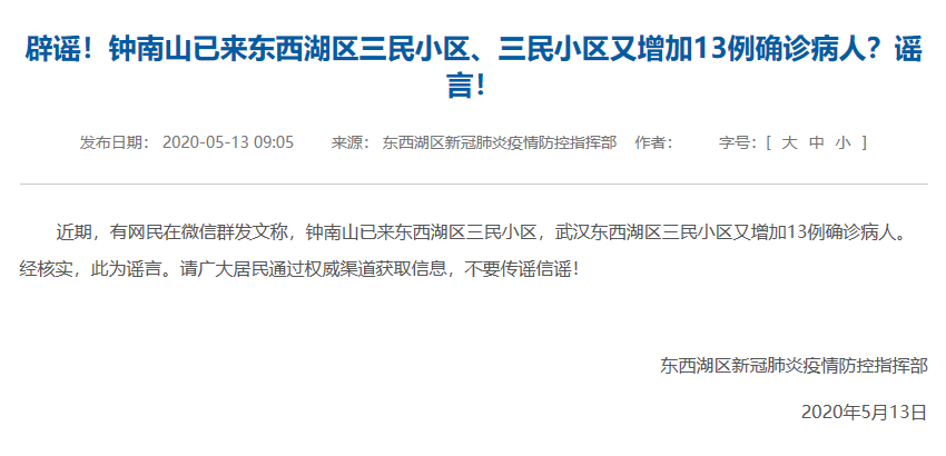 經(jīng)濟日報-中國經(jīng)濟網(wǎng)5月13日訊(記者朱國旺 郭文培)據武漢市東西湖區人民政府官網(wǎng)5月13日消息,近期,有網(wǎng)民在微信群發(fā)文稱(chēng),鐘南山已來(lái)東西湖區三民小區,武漢東西湖區三民小區又增加13例確診病人。經(jīng)核實(shí),此為謠言。請廣大居民通過(guò)權威渠道獲取信息,不要傳謠信謠。