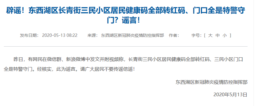 此外,東西湖區新冠肺炎疫情防控指揮部表示,經(jīng)核實(shí),“長(cháng)青街三民小區居民健康碼全部轉紅碼、三民小區門(mén)口全是特警守門(mén)”也系謠言。