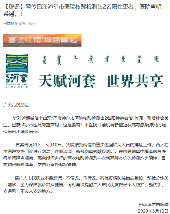 據巴彥淖爾市互聯(lián)網(wǎng)信息辦公室官微5月12日消息,針對近期微信上出現“巴彥淖爾市醫院核酸檢測出2名陽(yáng)性患者”的傳聞,巴彥淖爾市醫院鄭重聲明:這是謠言,巴彥淖爾市醫院目前沒(méi)有新型冠狀病毒感染肺炎的疑似病例和確診病例。