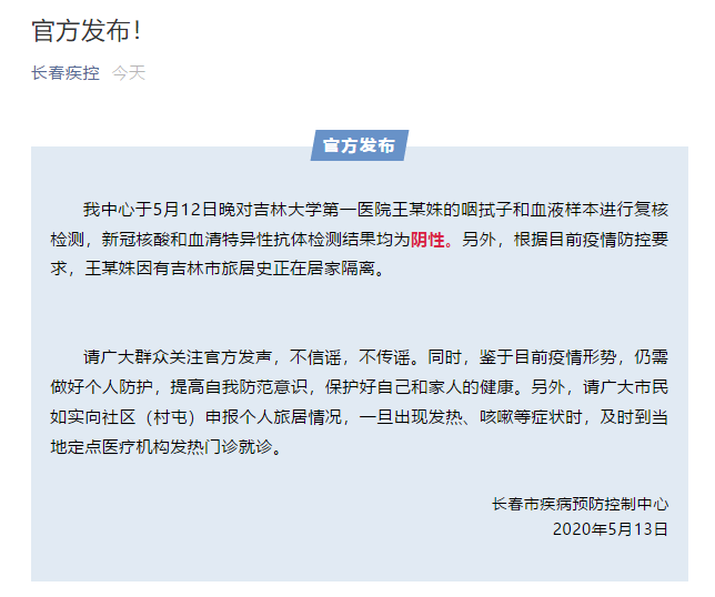 近日,有網(wǎng)傳稱(chēng)吉林大學(xué)第一醫院出現新冠病例。5月13日,長(cháng)春市疾病預防控制中心官微對此回應稱(chēng),長(cháng)春市疾病預防控制中心于5月12日晚對吉林大學(xué)第一醫院王某姝的咽拭子和血液樣本進(jìn)行復核檢測,新冠核酸和血清特異性抗體檢測結果均為陰性。另外,根據目前疫情防控要求,王某姝因有吉林市旅居史正在居家隔離。請廣大群眾關(guān)注官方發(fā)聲,不信謠,不傳謠。
