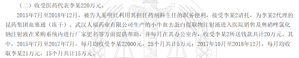 根據判決書(shū),2015年7月至2018年12月,被告人某明紅利用其擔任藥劑科主任的職務(wù)便利,接受“李某2”請托,為“李某2”代理的昆藥集團血塞通(凍干)、武漢人福藥業(yè)有限公司生產(chǎn)的小牛血去蛋白提取物注射液進(jìn)入醫院銷(xiāo)售及奧硝唑氯化鈉注射液在釆購系統內進(jìn)行廠(chǎng)家更名等方面提供幫助,并每月在其辦公室內,收受“李某2”所送錢(qián)款共計20萬(wàn)元。