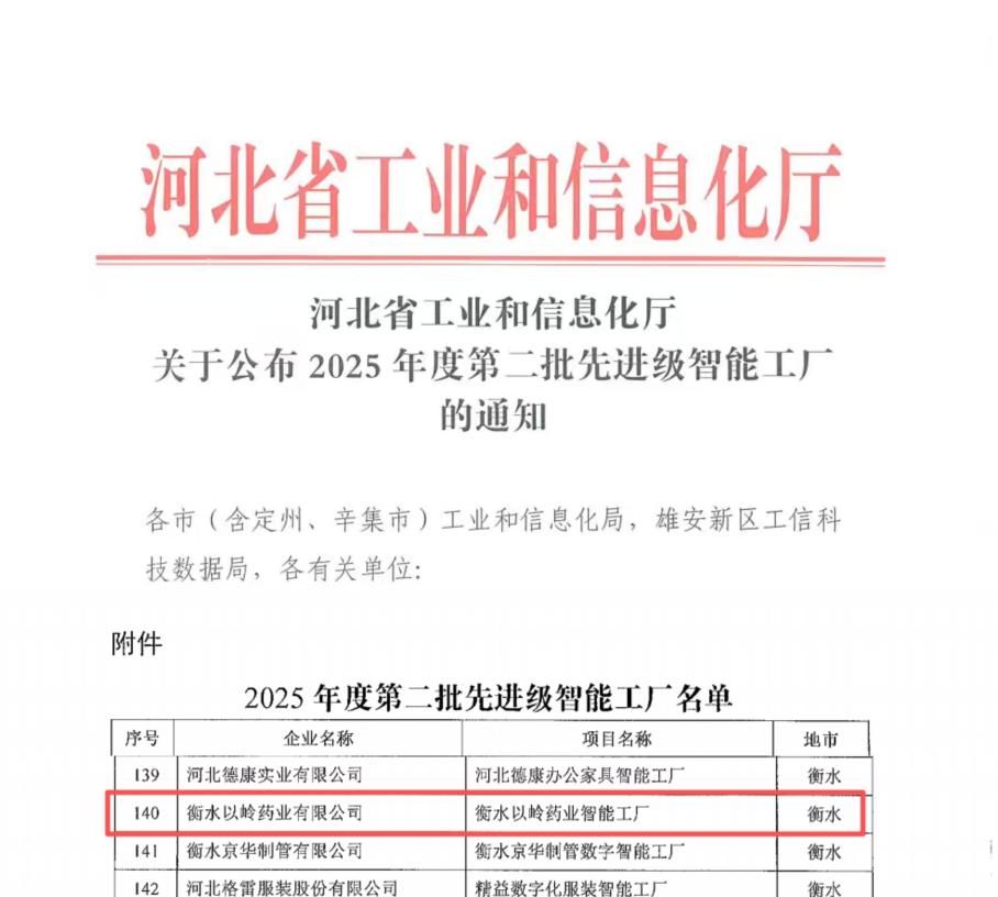 衡水以嶺藥業(yè)獲評河北省“先進(jìn)級智能工廠(chǎng)”