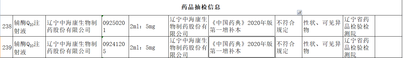 根據公告,該2批次不合格輔酶Q10注射液,標示生產(chǎn)企業(yè)為遼寧中??瞪镏扑幑煞萦邢薰?,生產(chǎn)批號為09250201、09241205,規格為2ml:5mg,不符合項目為性狀、可見(jiàn)異物。