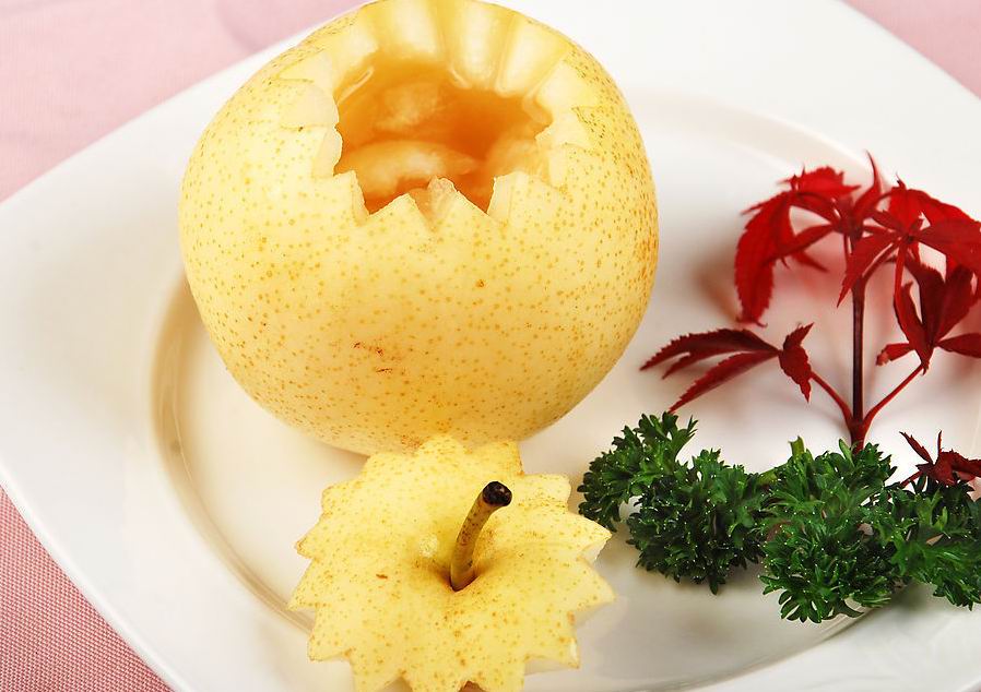 3、將梨放入燉盅中或一般的碗中,放入鍋中小火蒸約45分鐘后即可食用。