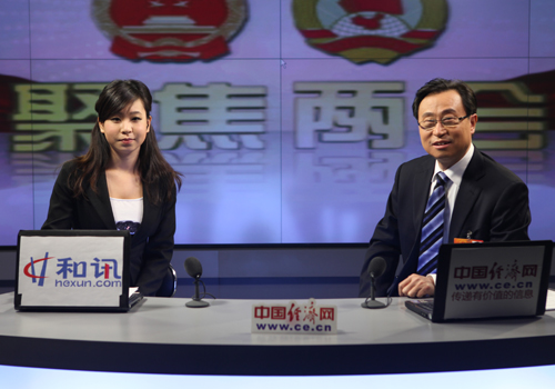 全國人大代表、山東禹王實(shí)業(yè)有限公司董事長(cháng)兼總裁劉錫潛(右)做客中國經(jīng)濟網(wǎng)(王耀峰 攝)